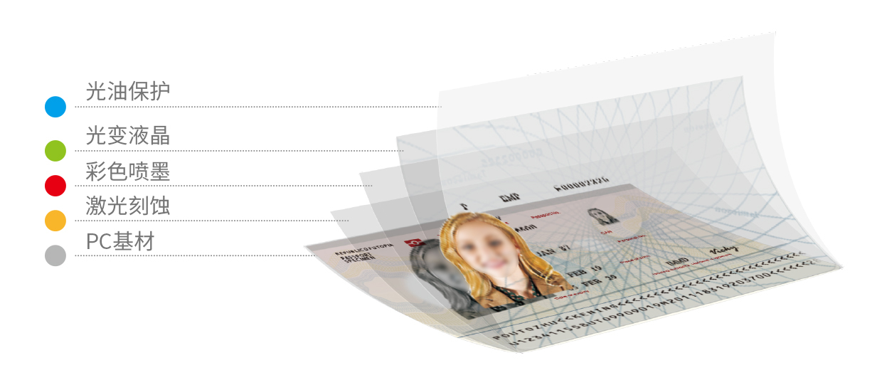 MLP工艺采用6重防伪机制:芯片防伪,物理载体防伪(PC材料及印刷底纹)、激光刻蚀个人信息防伪、UV彩色照片防伪、液晶光变油墨防伪,光油覆膜防伪。其中激光刻蚀、UV彩色照片、液晶光变油墨、光油覆膜都是个性化的防伪,即每个证件的图案或文本信息都可以与个人信息关联,可以大大提高证件的防伪水平。